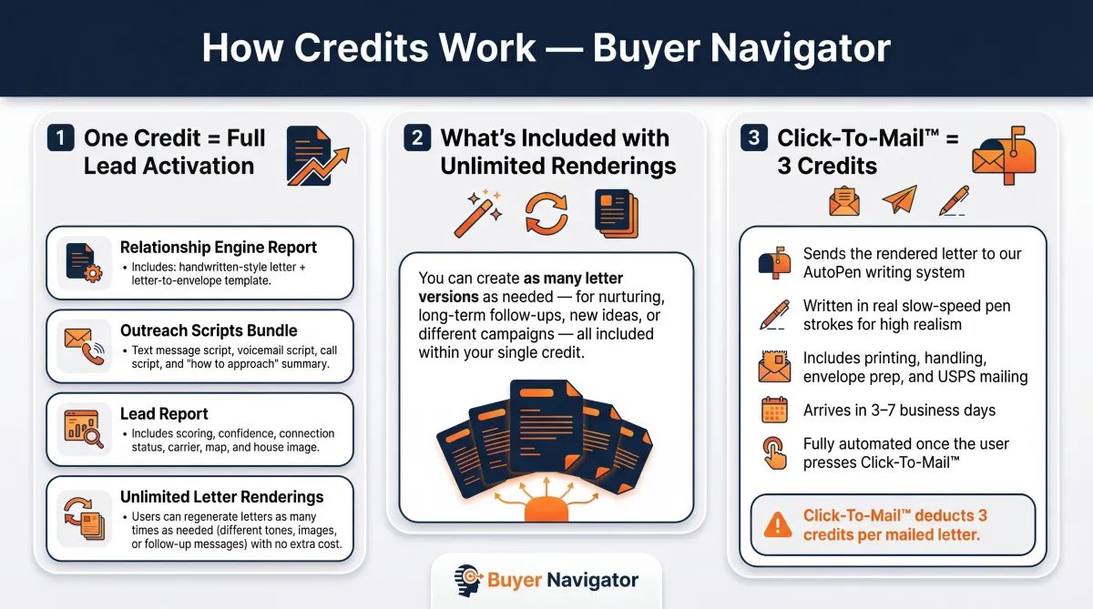 Each time a new lead enters your CRM, BuyerNavigator™ automatically generates a handwritten-style letter and mails it to that lead. This ensures every prospect gets a personal, tangible touchpoint, not just a digital interaction.